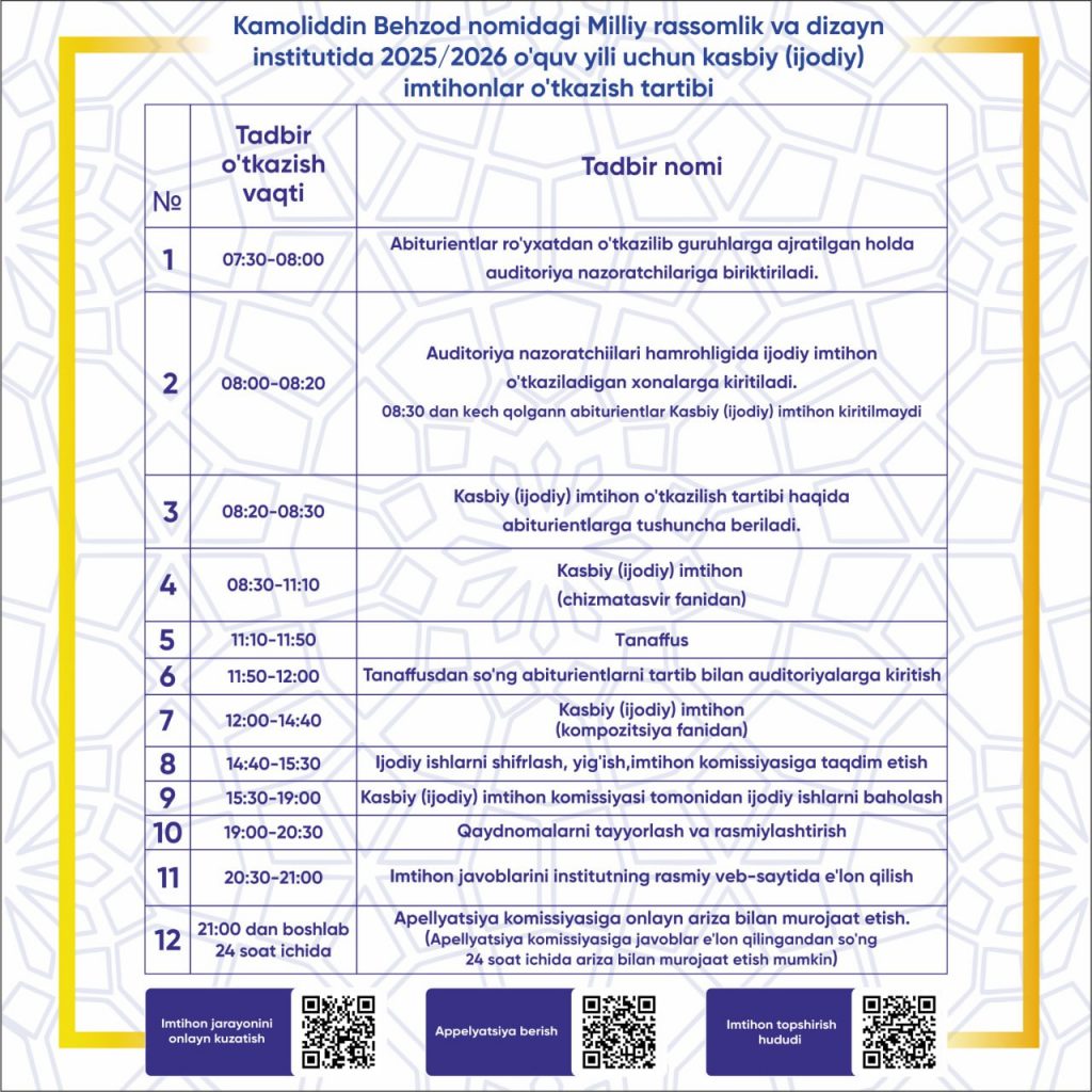 📍 Kasbiy (ijodiy) imtihonlar Toshkent shahri, Mirobod tumani, Mironshoh ko‘chasi 123-uy (https://maps.app.goo.gl/M5figfuiBweMtLn5A) manzilida joylashgan Kamoliddin Behzod nomidagi Milliy rassomlik va dizayn instituti bosh binosida yuqoridagi tartib asosida o‘tkaziladi.