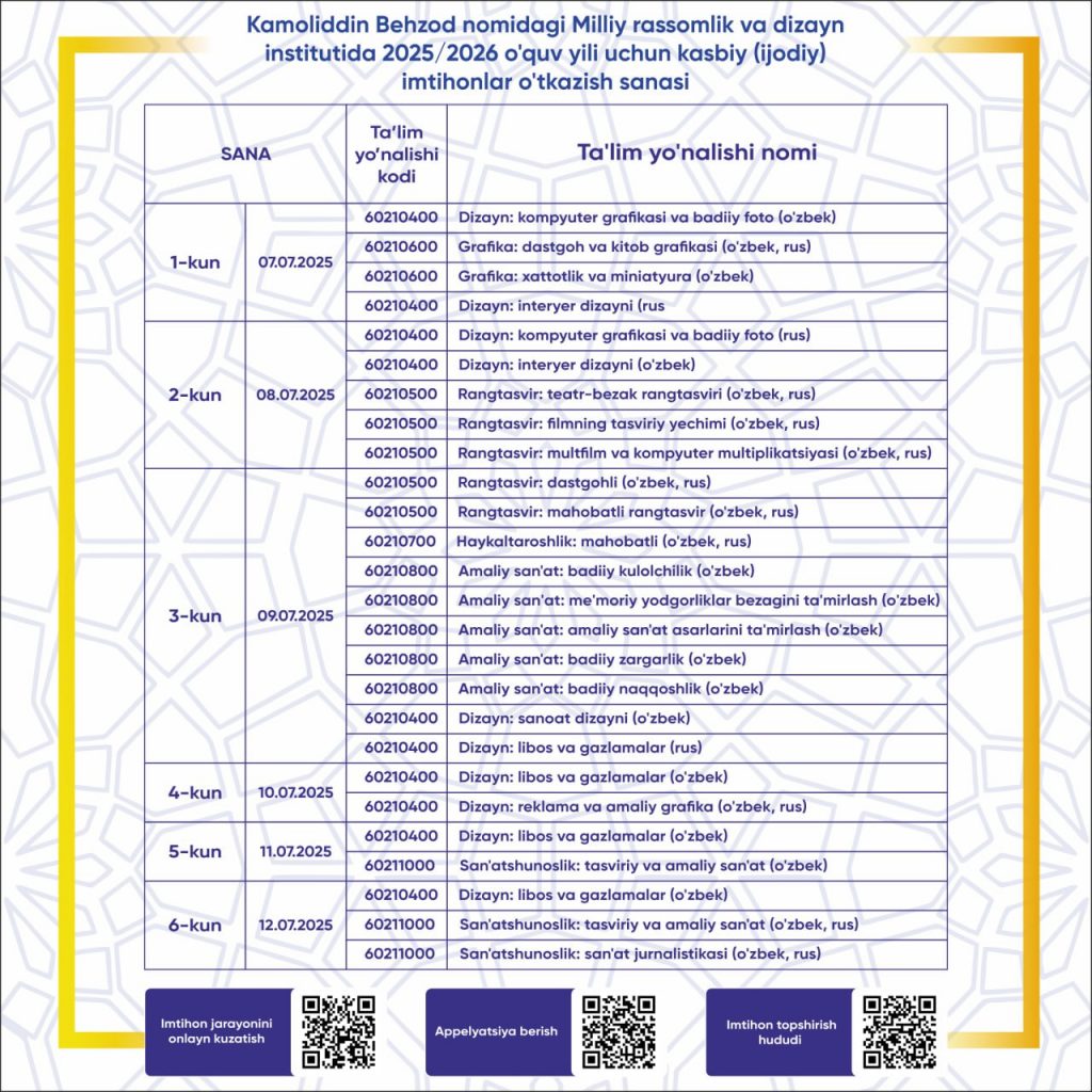 🗣 Kamoliddin Behzod nomidagi Milliy rassomlik va dizayn institutida 2025/2026-o‘quv yili uchun Kasbiy (ijodiy) imtihonlar joriy yil 7-iyuldan 12-iyulgacha yuqoridagi reja-grafik asosida o‘tkaziladi.