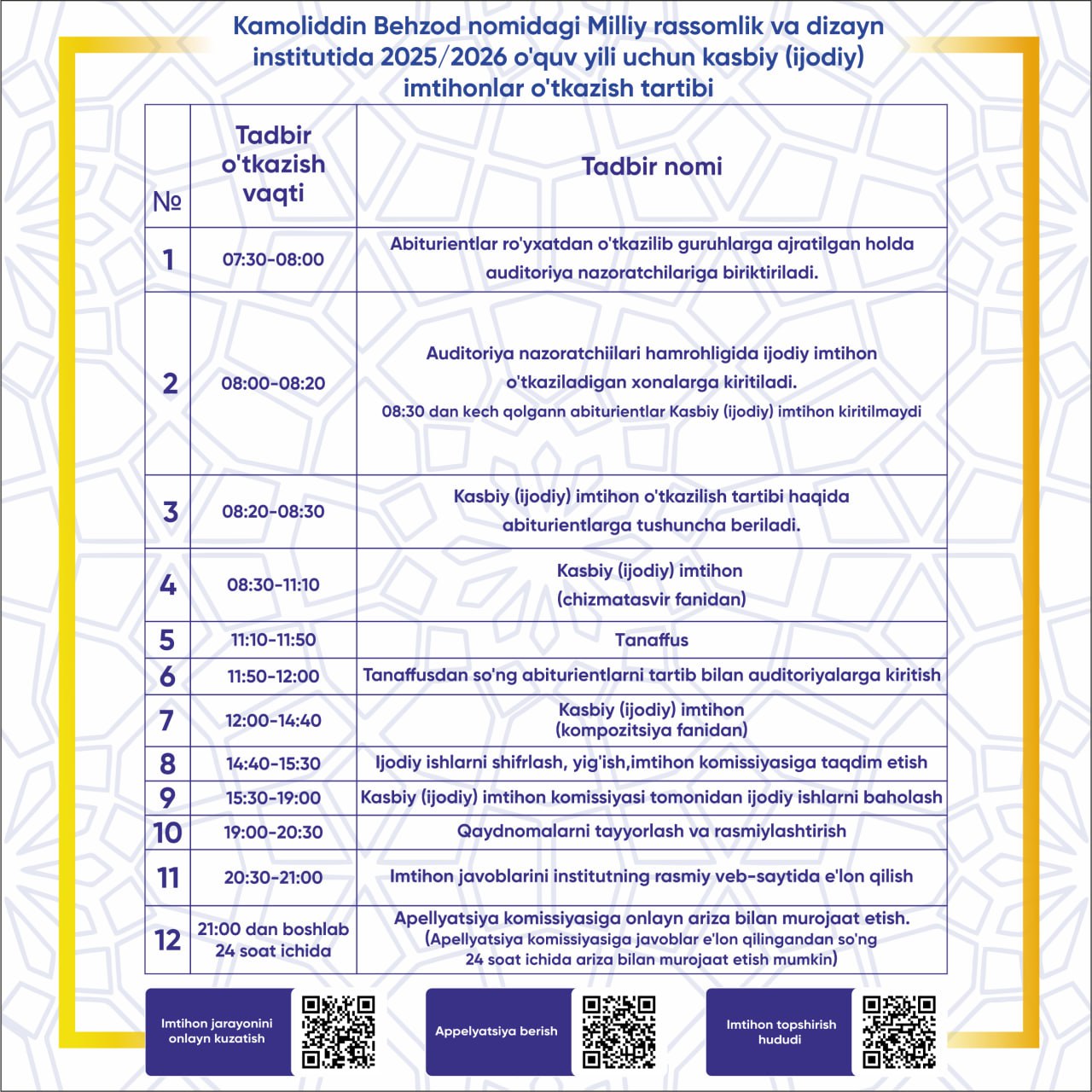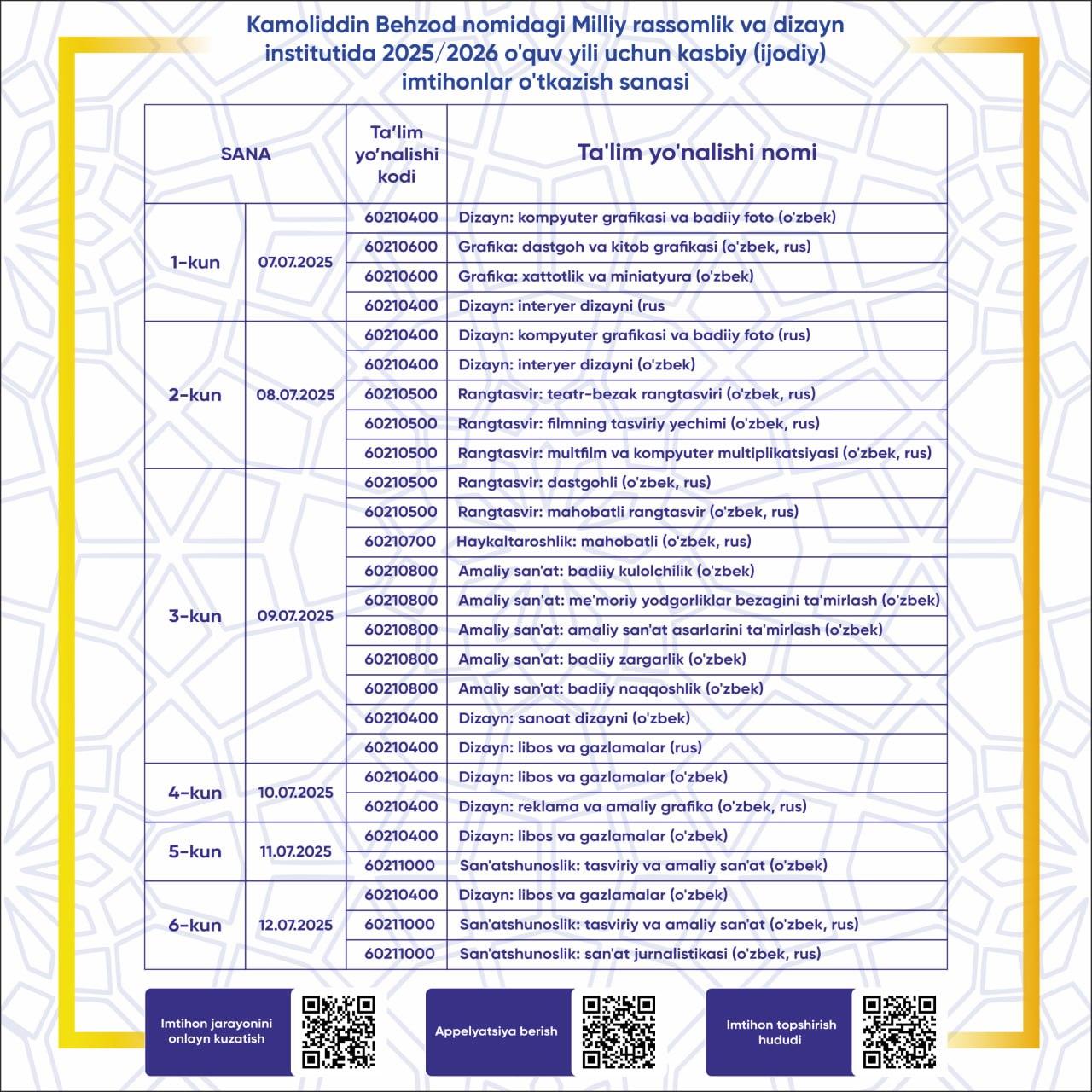 🗣 Kamoliddin Behzod nomidagi Milliy rassomlik va dizayn institutida 2025/2026-o‘quv yili uchun Kasbiy (ijodiy) imtihonlar joriy yil 7-iyuldan 12-iyulgacha yuqoridagi reja-grafik asosida